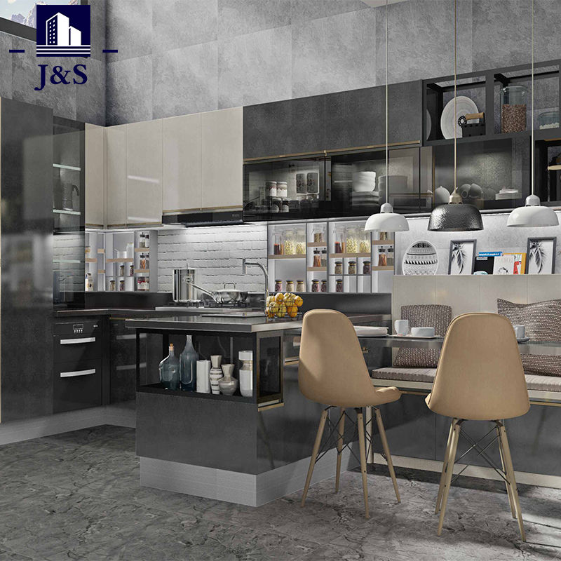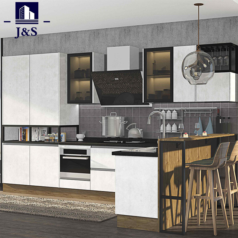 Promozione fornitura J&S La cucina di campagna di lusso progetta il miglior prezzo. Porta della cucina color cemento PET, piano da banco resistente in acciaio inossidabile.